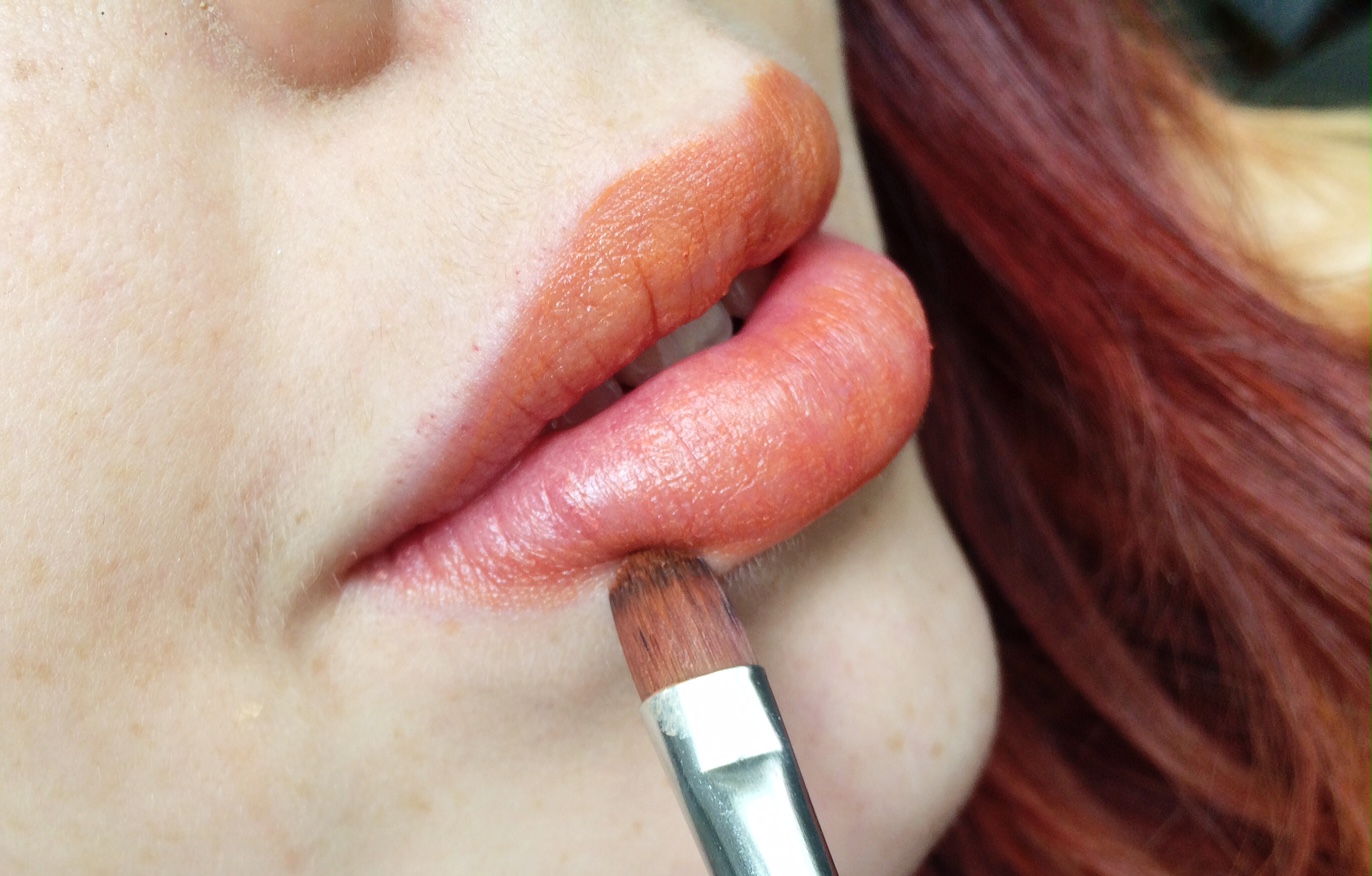 - Using the brush and a dab of the orange, brush it along the outside of your lips for a fuller effect. Do not blend.Â