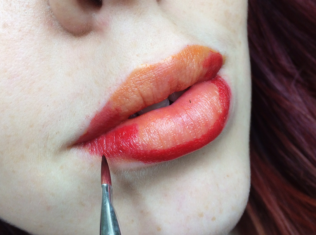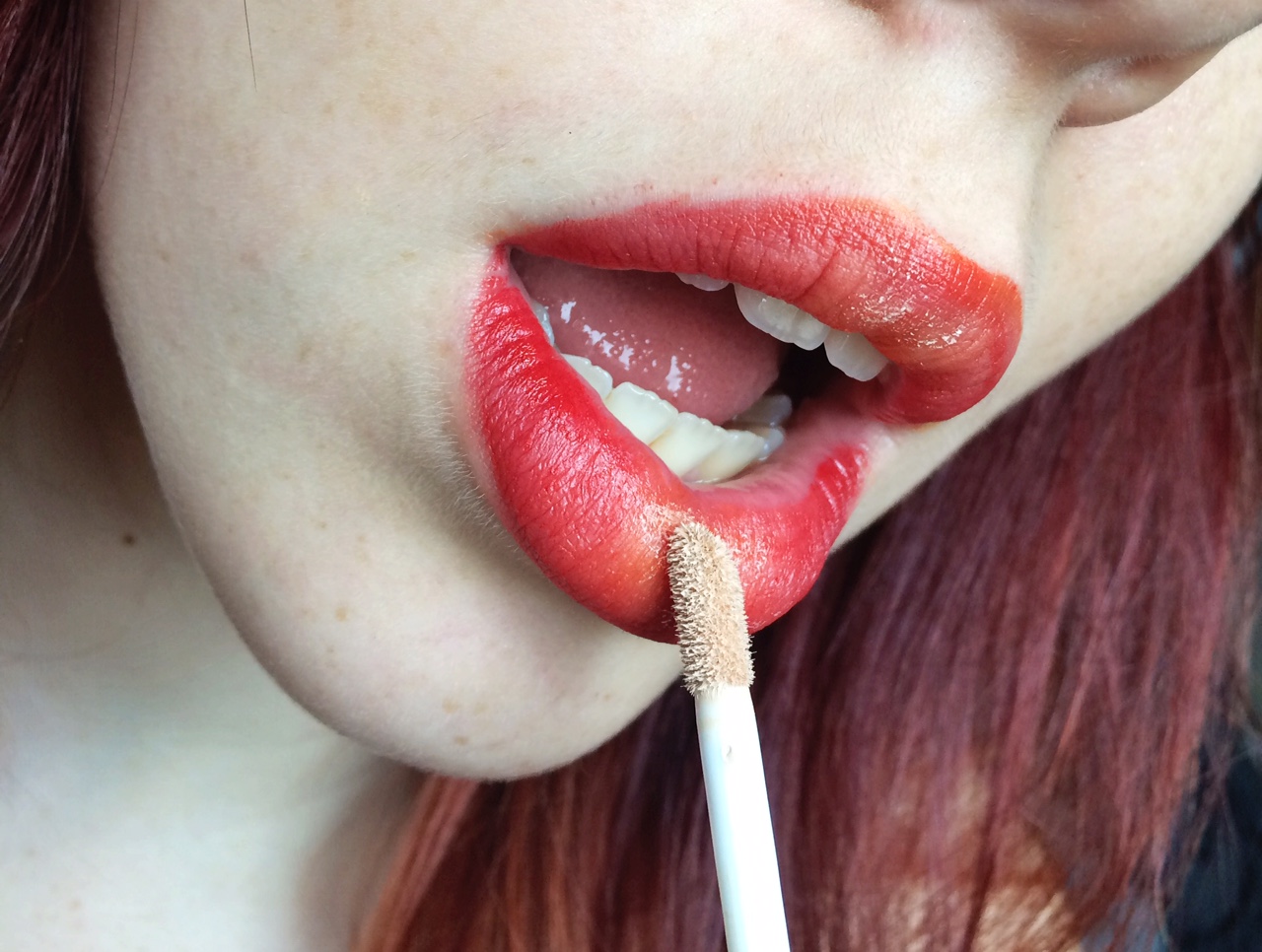 - Using the brush, apply red to all corners of your lips and the bottom line, blend all inwards leaving a finger-space of orange in the middle.